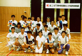 NTT東京 池田 信孝 総監督 松野 修二 コーチ 宮 康二 選手 町田 文彦 選手 須賀 隆弘 選手 久保田 雄三 選手 竹鼻 拓也 選手 大田 慎二 選手 厚木通研バドミントン部参加選手 草場 律 西村 浩志 都倉 康弘 伊東 雅之 鮫島 康則 山崎 謙治 小宮山 亨 徳永 慶一郎 今村 浩 森久保 貴 五十嵐 愛NTT東京同志の模範試合ダブルス1ゲームの後、草場・西村、都倉・ 伊東で1ゲームで対戦してもらった。すごい模範試合の後でしかもVI Pの前だからガチガチに緊張したが、皆数点は取らせてもらっって、盛 り上がった。今村・森久保、小宮山・徳永と対戦、最後は松野コーチと 五十嵐さんで組んでもらって、鮫島・山崎と対戦してもらったころには、 和やかな雰囲気になって、サインをもらったり写真を撮ってもらったり した。始めは日本最強軍団におそれをなしていたが、終ってみると同じ 社員でも一生会わないだろうと思っていた所が、夢のような試合、交流 が実現して非常に楽しむことができた。