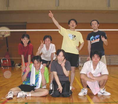 荒武@にゃんです。m(^_^) 先週末8/10(日)厚木市猿が島体育館にて厚木リーグ開幕しました!! 森の里NYANチームは昨年2部残留、構成は次の通り。 1.イチモッツ女子大(イチモッツ:乙部) 2.森の里NYAN(NTT厚木通研:伊東) 3.酔球倶楽部(北興化学:内堀) 4.クラブアフター(クラブアフター:千田) 5.ホットショット(ホットショット:渡辺) 6.荻野NS(荻野NS:斉藤) 厚木リーグの今年の概要ですが、昨年1部で優勝したP天使(ぺてんし)が解散、 各チーム順位が一つ繰り上がっている。 新規チームが凄く沢山あって、4部は3つのリーグ(各4チーム)からなる。 ここは北山君の超星や相模原の小川君率いるPoohちゃんなど、1部クラスの 強豪がひしめく混戦となることが予想される。 10時から開会式とかあって、早速試合も始まった。 初日は昨年辛勝している2チームとの対戦になった。 台風一過の晴天で、体育館の中はものすごい暑さと湿度だった。 お昼換気前は35度を超えていたかもしれない。 ●森の里NYAN 4−1 荻野NS LD 上野・北田 2(15-12,15-0 )0 繁原・佐野 X1 大録・藤田 2(17-16,17-14)0 山本・佐野 MD 伊東・湯浅 2(15-8,7-15,15-4)1 松村・高橋 MS 荒武 0(10-15,13-15)2 山本 X2 湯浅・北田 2(15-9 ,15-9 )0 斉藤・繁原 鬼島夫妻と山岸さんが出れない危機の中、新加入の北田さん、湯浅君が頑張ってくれた。 LD:1ゲーム目コンビネーションが今一だった。 インターバルで話し合って2ゲーム目歯車がかみ合うと見やすいコートも味方して圧勝した。 戦い方が点数に反映される典型的な例だと感じた。 X1:練習不足の大録さんが心配だったが、連続セティングを制するすばらしい試合だった。 藤田さんも後衛からバシバシ打っていた。 MD:LOB練習でもやっているので心配はしていなかったが、2ゲーム目は受けにまわって、 やはりシャトルが飛ぶときには攻撃側が絶対有利で押し切られた。3ゲーム目は修正して勝利。 MS:去年3点しか取れず惨敗した山本さんとの対戦、今年もシャトル回しと暑さにやられて完敗だった。 夏に弱いのでコート横にドリンクや氷のうを用意はしていたのだが、最後はシャトルを見送るだけの フラフラ頭痛状態で、試合後冷水シャワーを10分くらい浴び続けて何とか息を吹き返した。 X2:前日荻野中の練習で対戦してその強さを警戒していた斉藤・繁原との対戦。 しかし若い2人のパワフルプレーで(途中危なげなシーンもありながらも)勝利できた。 1試合目がすべて終わった1時半くらいに窓を全開にして換気して、 ものすごく涼しい風が吹き込んできた。う〜ん、外気温も30度は超えているのだが。。 ●森の里NYAN 4−1 酔球倶楽部 LD 上野・北田 2(15-6,11-15,15-5)1 西山・井上 X1 湯浅・北田 2(15-3 ,15-4 )0 内堀・大沢 MD 伊東・荒武 0( 8-15, 7-15)2 村山・杉山 MS 湯浅 2(15-1 ,15-2 )0 本橋 X2 大録・藤田 2(15-3 ,15-12)0 今井・若林 LD:西山さんのネット前と、井上さんの後衛からの強打が上手くかみ合うと なかなか崩せなかったが、ひとたび得点できると連続得点ができた。 逆にこちらも連続得点されることが多かった(課題)。 X1:ラリーになる前に押し切ることが多く、湯浅君のエースが光った。 北田さんは先の女ダブも含めてショートサーブがすごく安定していて、 いつもネットすれすれと云う感じだった。 MD:クロス系強打の杉山さんと、安定性のある村山さんのペア。 特に上げてる訳でもないのだが、なぜか攻撃パタンに持ち込まれて、 こちらのショットも浮いていることもあっていいところなく終わってしまった。 私の前衛で置きに行くショットが全部ネットになり、攻撃時のミスが多く、 クロスネットもサイドを割るなど課題山積だった。 MS:男ダブ後、やっぱり冷水シャワーを浴びに行って半分くらいしか応援出来なかったが、 とにかくラリーになっても湯浅君の精度が高くて安心して見ていられた。 特にアタックロブはエンドライン直前に落ちる感じで見事なものだった。 X2:またまた大録・藤田ペアがいい味を出していた。 今井さんのショットがトリッキーで、やられそ〜なときに 藤田さんのスーパーレシーブが冴え、つないだ後の大録さんのシャトル回しで 相手にミスをさせて取ることができたのが大きかったと思う。 と云うことで、2つ取れて上々の滑り出しです。個人的には2つ負けて面目ありませんでしたが。 次は11月、それまでにバージョンアップを決意した週末でした。。。試合後パチリ。Photo by Okawa
